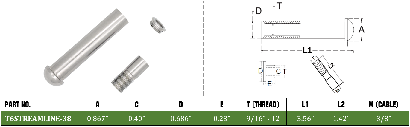STAINLESS STEEL STREAMLINE RECEIVER, STUD & CAP FOR 3/8" CABLE - T316