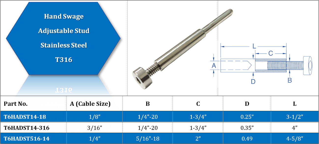 STAINLESS STEEL HAND SWAGE ADJUSTABLE STUD T316